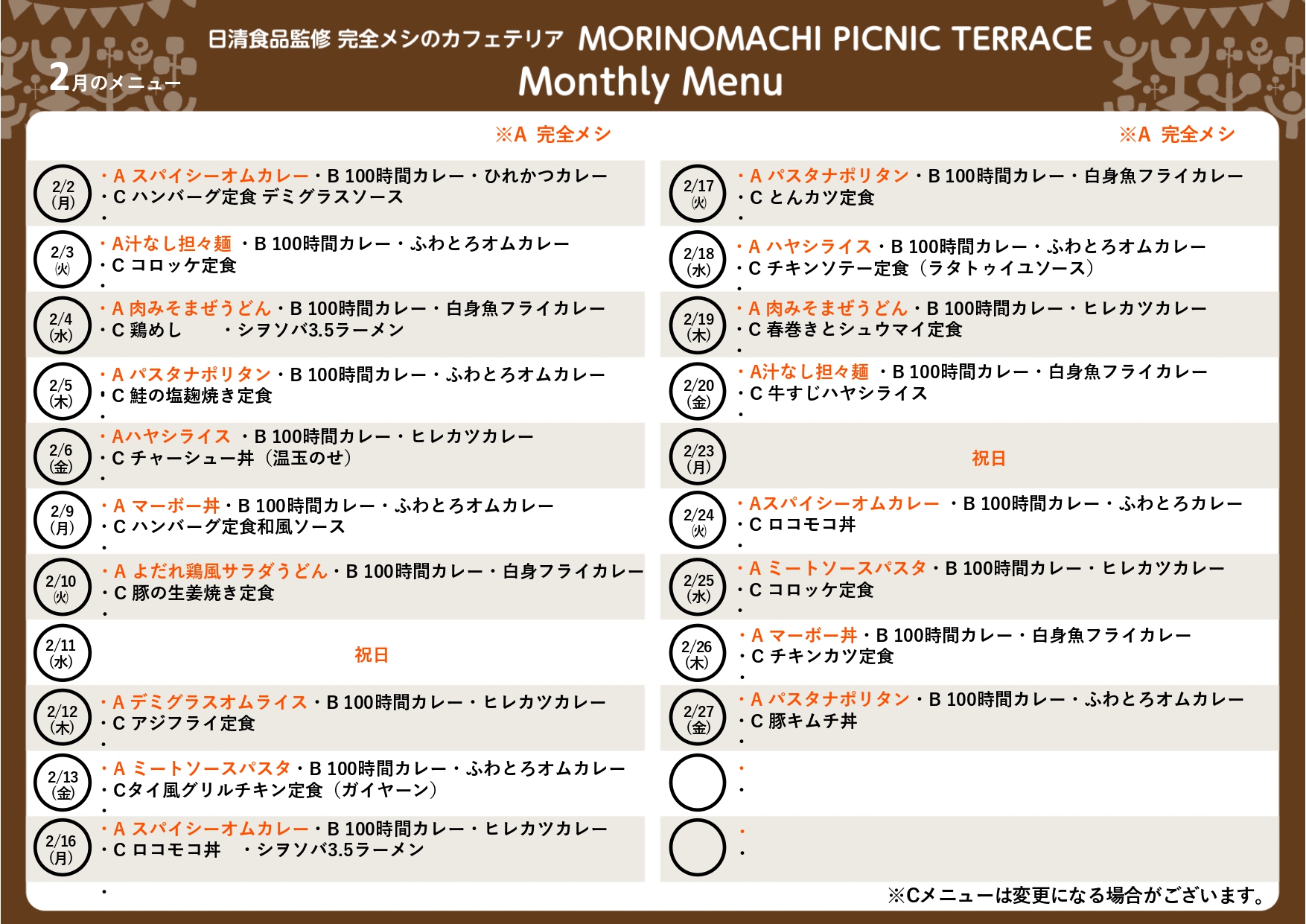 「MORINOMACHI PICNIC TERRACE(杜の街ピクニックテラス)」2026年2月の月間メニューを更新いたしました。